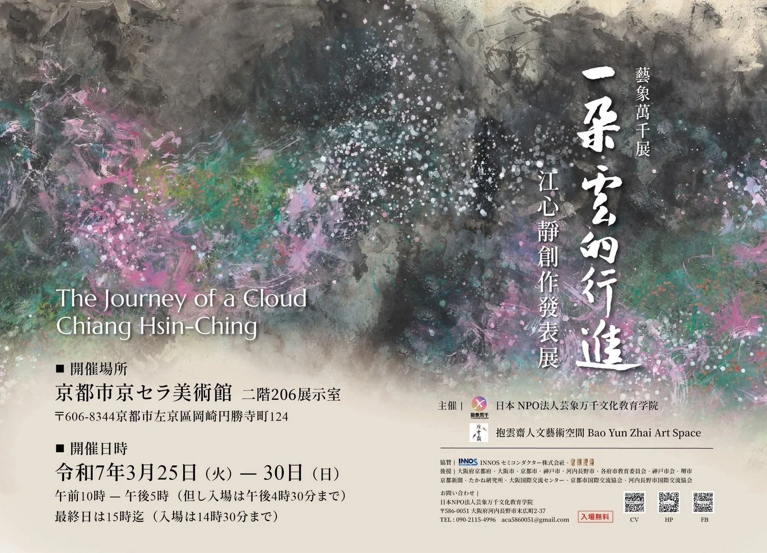 また、京都の寺院文化は「無常」という概念を大切にしており、すべてのものは時間とともに変化し、流動するという考え方を持っています。この無常観は、水の流れと同様に、江心靜の作品にも表れています。作品に見られる墨のにじみや色彩の交錯は、固定された形を持たず、鑑賞者の視点によって異なる解釈が生まれます。それはまるで、京都の枯山水庭園に見られる「砂紋」が水の存在を象徴するように、筆運びや線の流れが、意識と記憶の動的な変化を生み出しているかのようです。